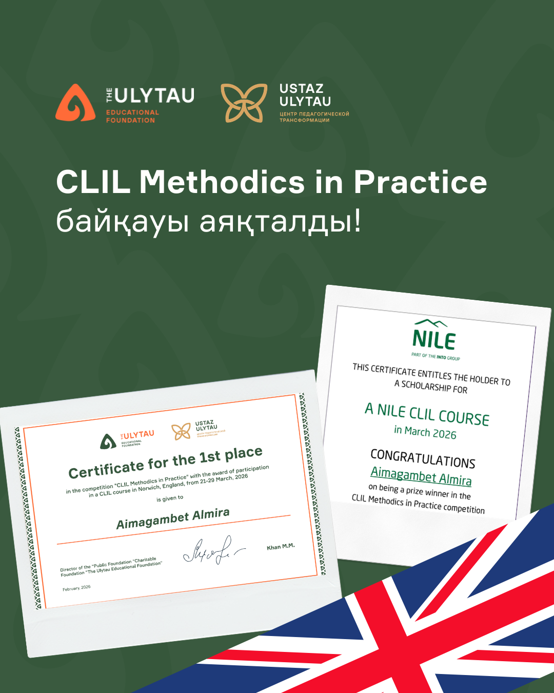 Жүлде ретінде Norwich Institute for Language Education, Англия, 3 гранттық сертификат ұсынады: олардың бірі — 21–29 наурыз аралығында Норвич қаласында өтетін офлайн (face-to-face) оқу курсына, ал қалған екеуі — CLIL бағдарламасы бойынша онлайн оқуға арналған. NILE (Norwich Institute for Language Education) ұйымы әлемнің түкпір-түкпіріндегі мұғалімдерге арналған кәсіби дамыту курстарын жүзеге асырады, және сол бағдарламалардың бірі — пән мен тілді кіріктіріп оқытуға бағытталған CLIL курсы.